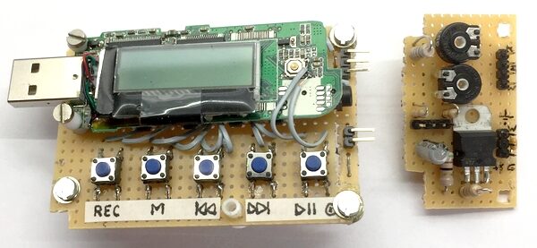 Na een succesvolle eerste test heb ik de MP3-speler op gaatjesprint gemonteerd (Fig. 4). Omdat de bedieningstoetsen aan de zijkant zaten en je er daardoor in de behuizing van de cassetterecorder niet goed bij kon komen, heb ik deze uitgevoerd naar aparte druktoetsen bovenop de gaatjesprint. Rechtsonder de 1,5 V voeding met een LM317, en daarboven 2 instelpotmeters voor het opname- en weergaveniveau. En dit werkte prima in de testopstelling van figuur 5.